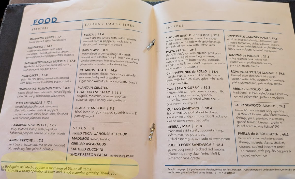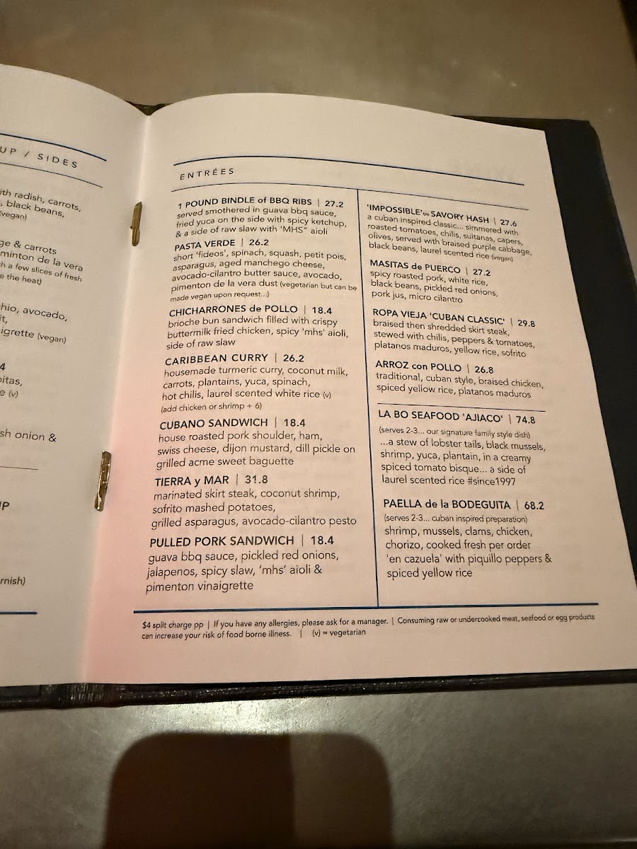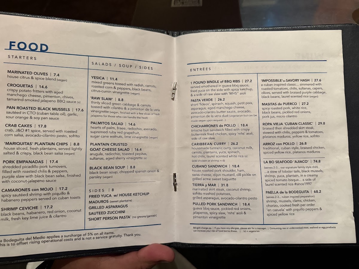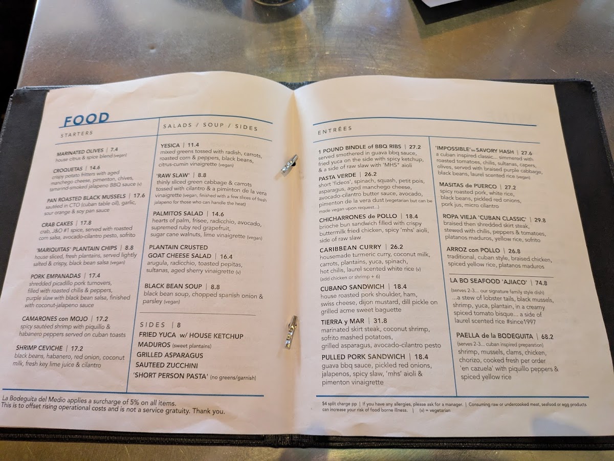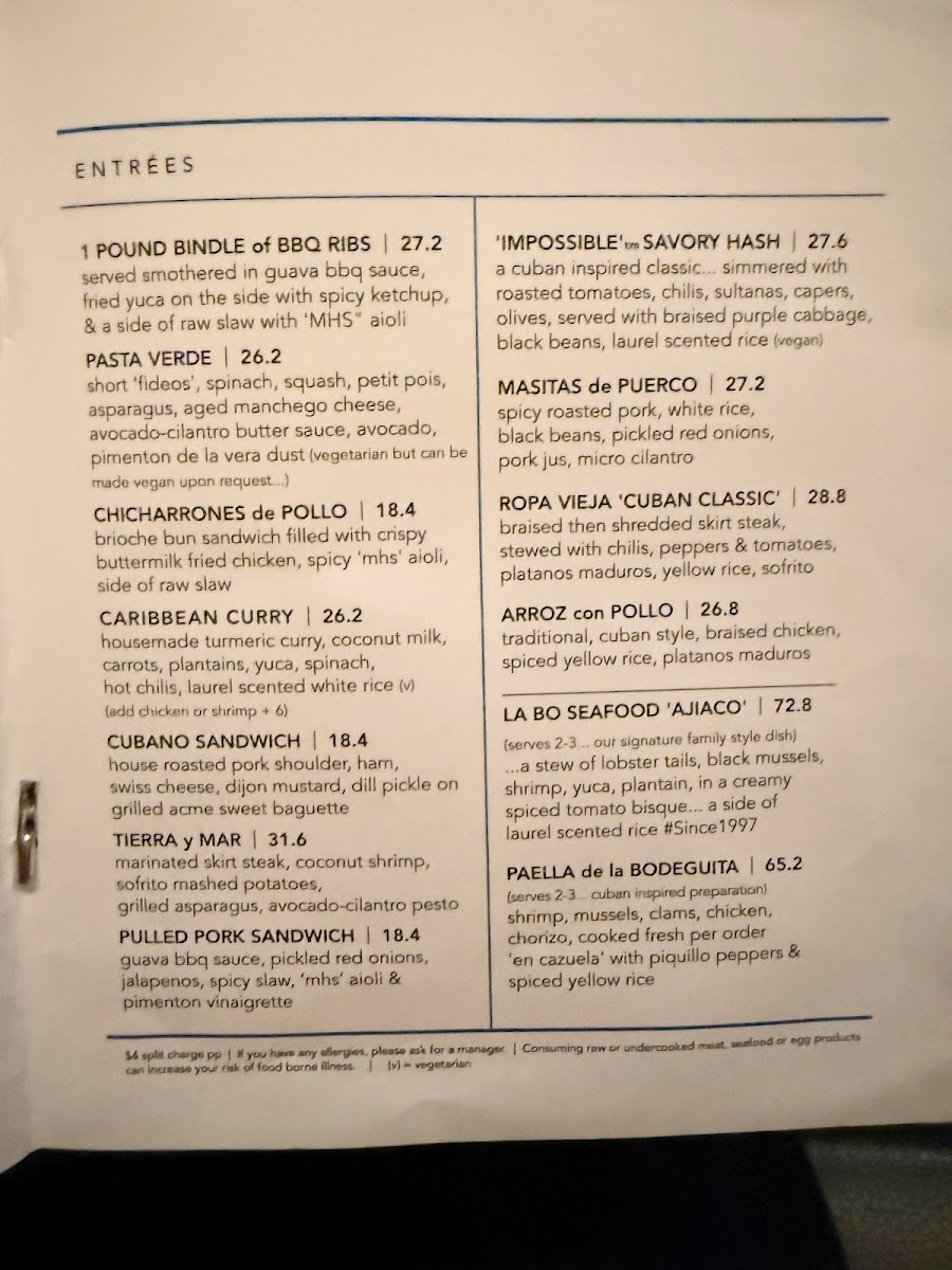 Main Courses: The entrees feature traditional Latin American and Caribbean dishes, including Paella De La Bodeguita, Arroz Con Pollo, Ropa Vieja, Cubano Sandwich, Camarones Con Mojo, and various seafood and grilled meat options. These items provide a range of flavors emphasizing both protein and vegetable elements.